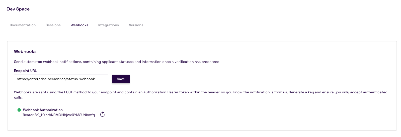 Providing us your endpoint URL is easy. Simply head to <https://enterprise.personr.co/dashboard/dev-space> and click on Webhooks.